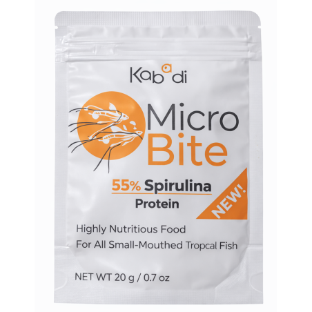 Kabadi Micro Bite er specielt udviklet til de mindste og voksende unge fisk. Mikropelletsene har en størrelse på +- 0,05 til 0,5 millimeter, hvilket gør dem meget velegnede til unge yngelfisk. Med et meget højt proteinindhold på 55% hjælper Micro Bite med optimal celleudvikling og hurtig, sund vækst.